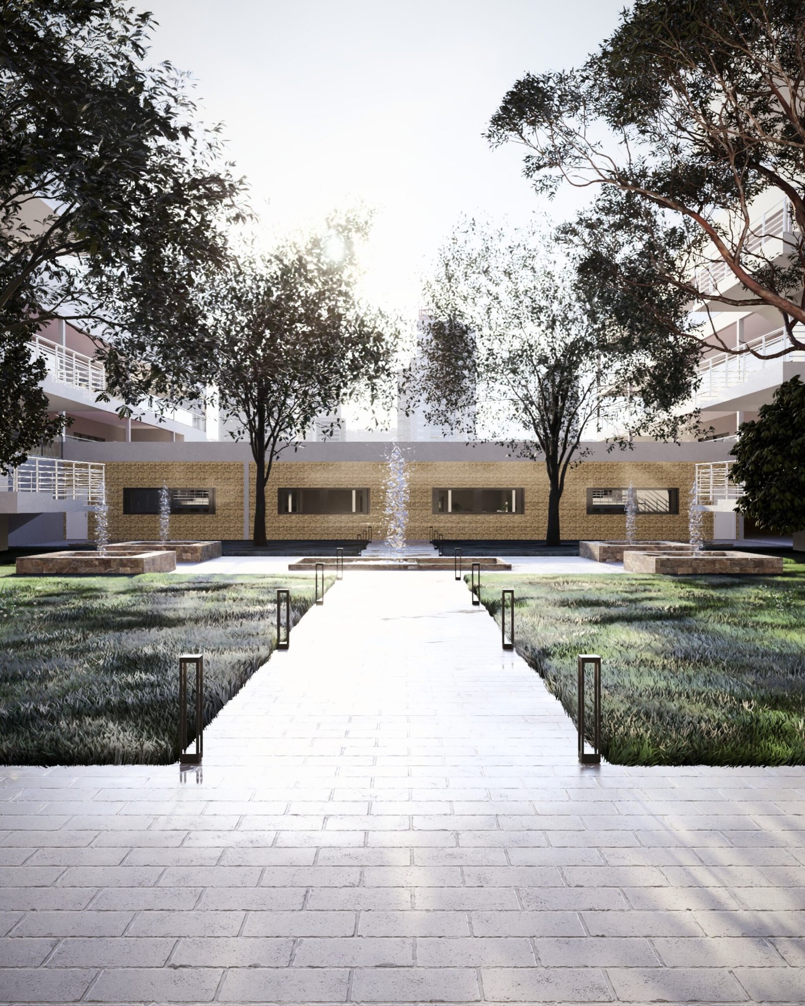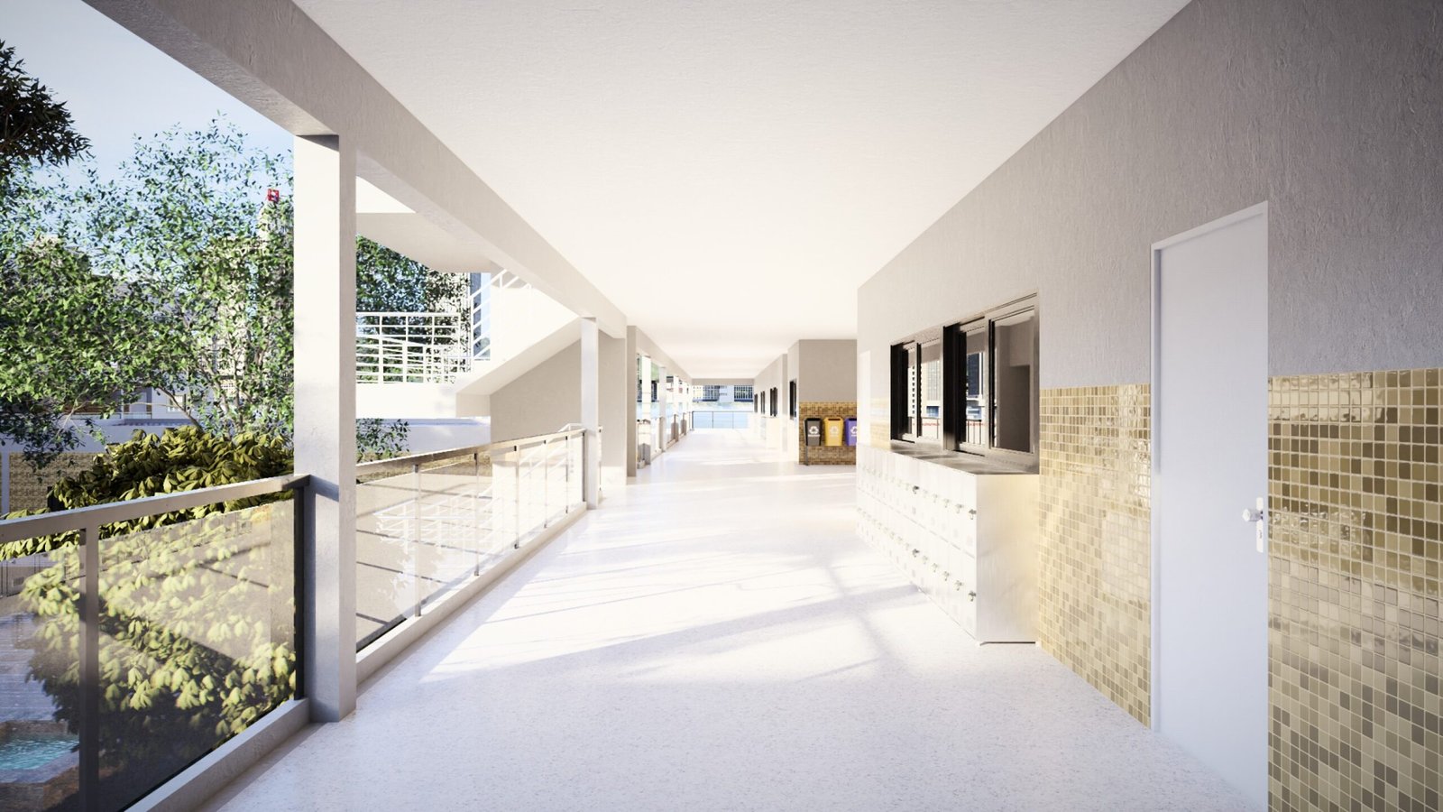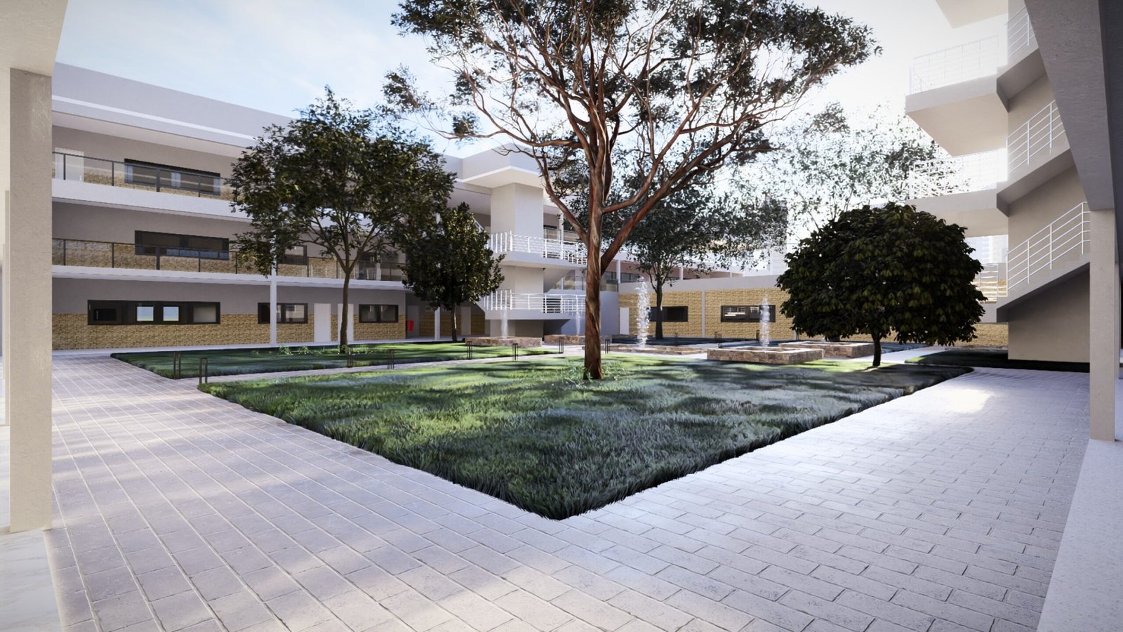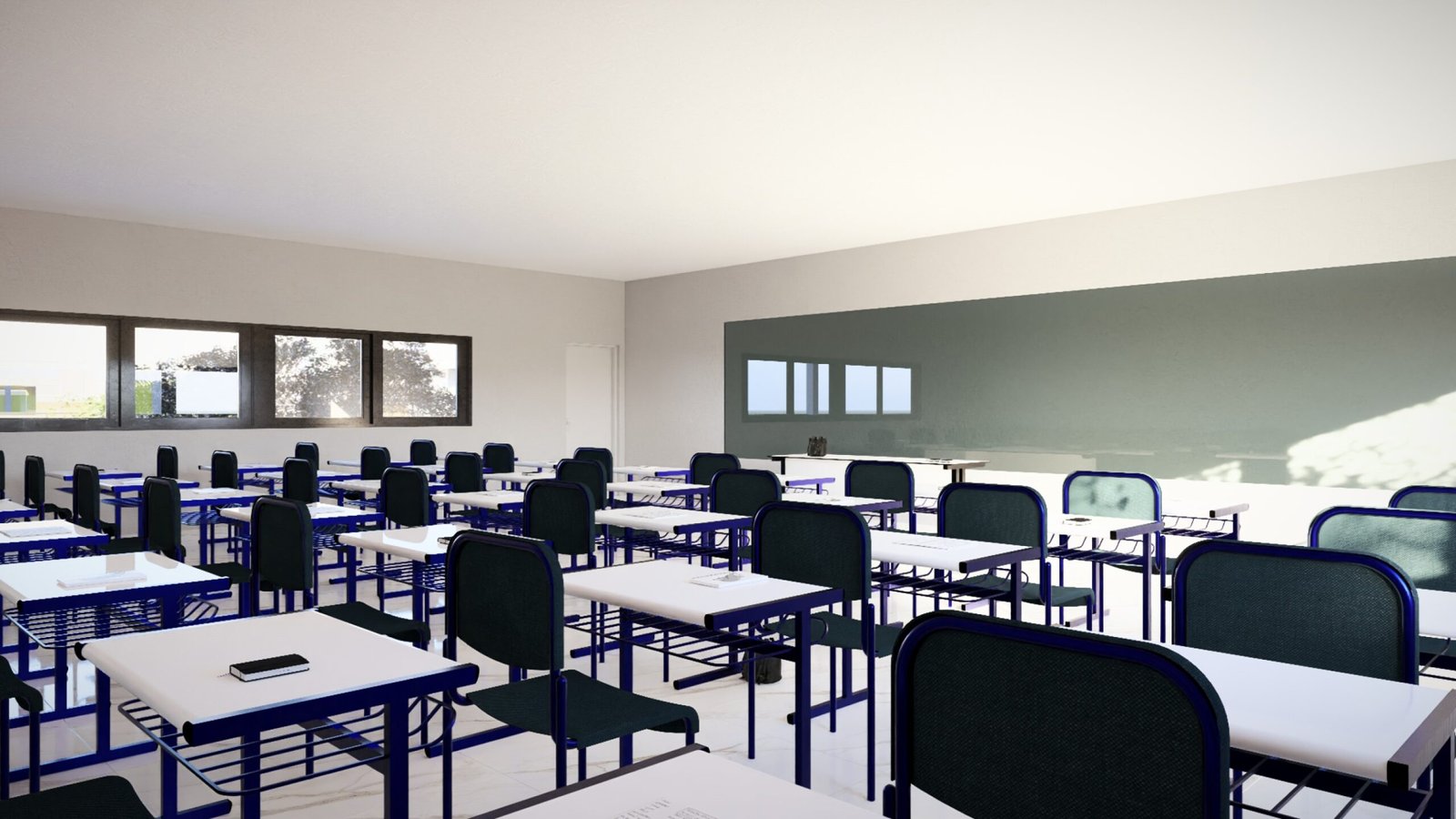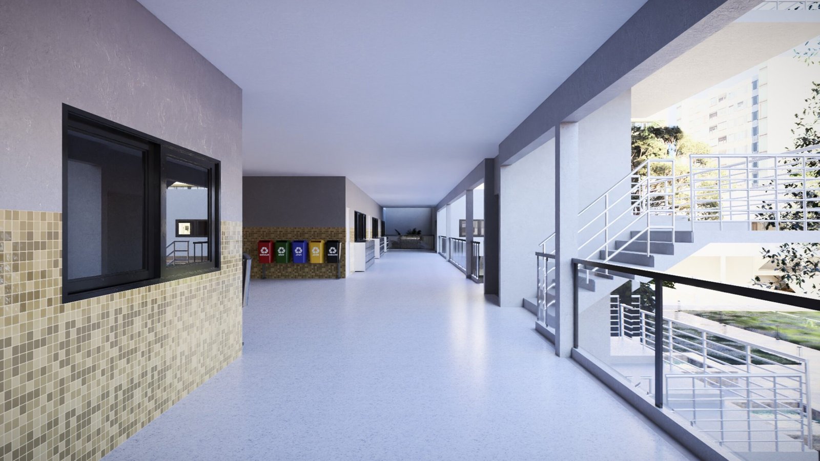 As salas de aula ficam dispostas com todas asportas viradas para o grande pátio interno, com circulações bem dimensionadas, priorizando ailuminação e ventilação natural. Os ambientes de coordenação e serviço sãodispostos na parte inferior, tendo controle maior naorganização e circulação. O Colégio foi dimensionado inteiramente abaixo donível da rua, para garantir maior quantidade de pavimentos, suportando assim, alunos do 6⁰ ano do ensino fundamental, até o 3⁰ ano do ensino médio, dispostos em andares diferentes.